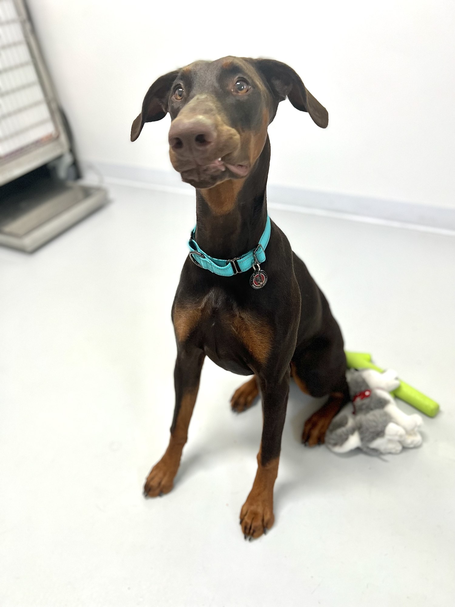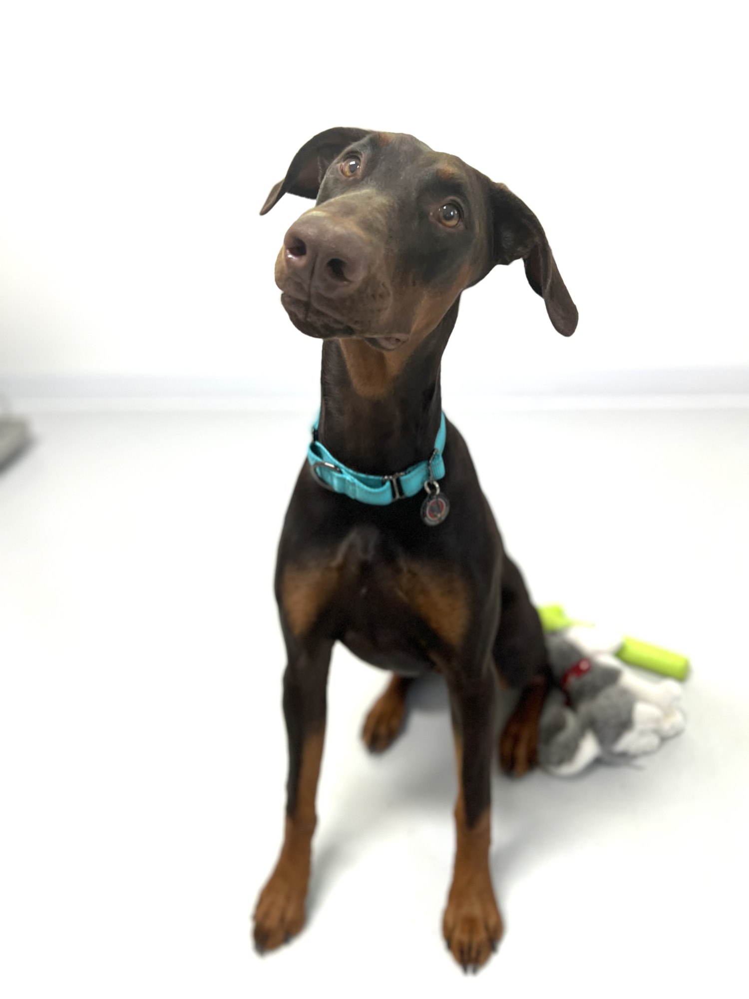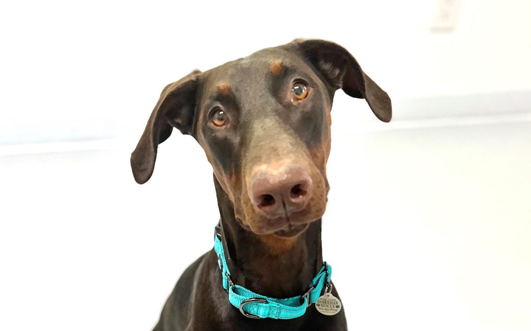 Poppy is a 7 month old female Doberman. Allll puppy, this sweet girl believes everything is a toy or game to have fun with. She goes 100%, naps, and repeats. Poppy would love an active family, with the patience and dedication to keep up with her training. She loves to learn and is very smart. Poppy is good with other dogs, and loves to be by her people. She is working on being ok spending a bit more time alone, and learning that the crate is not a bad place. Poppy will enjoy following you around, joining you on adventures, attending training, and getting her ears and belly rubbed.