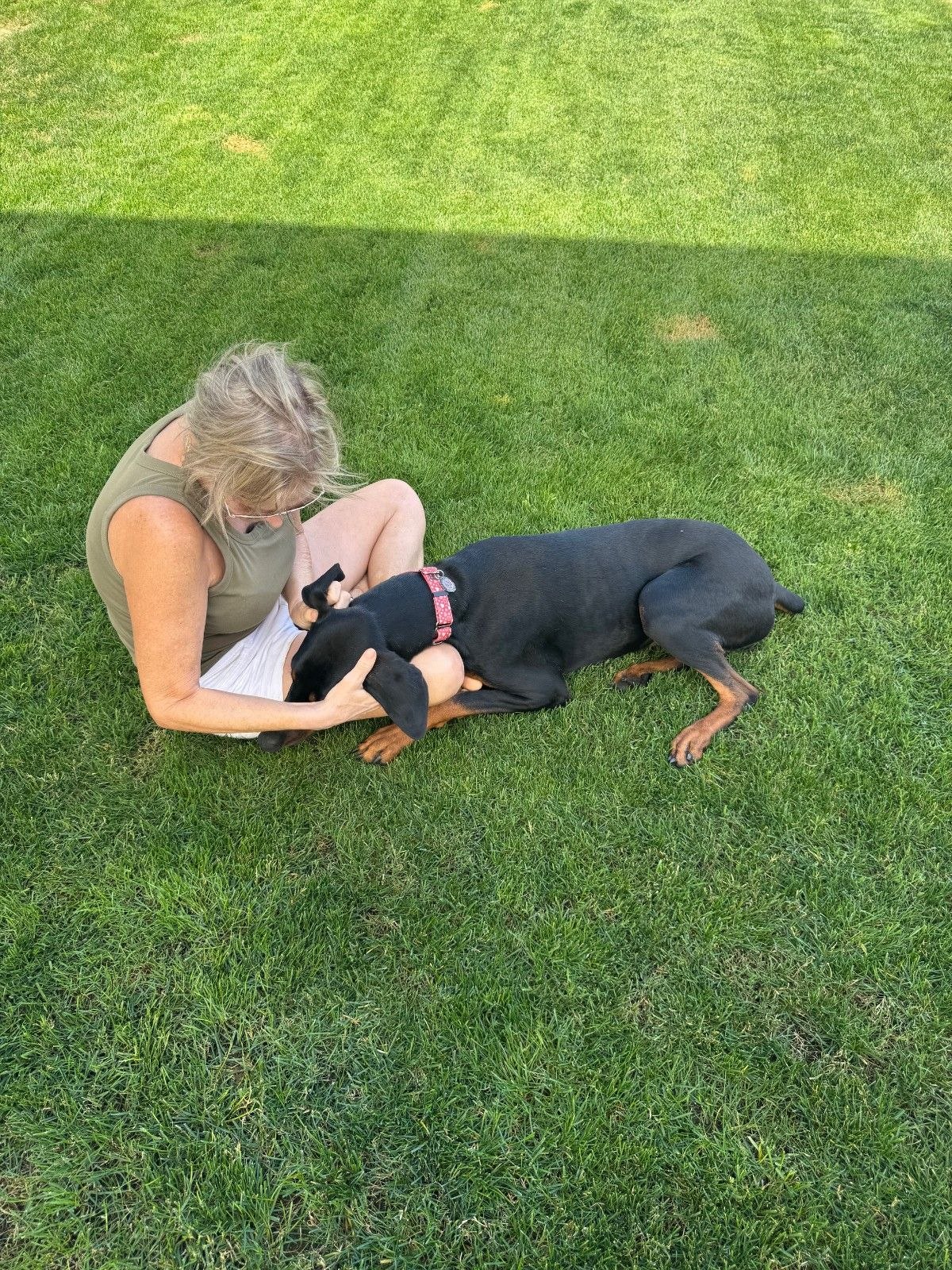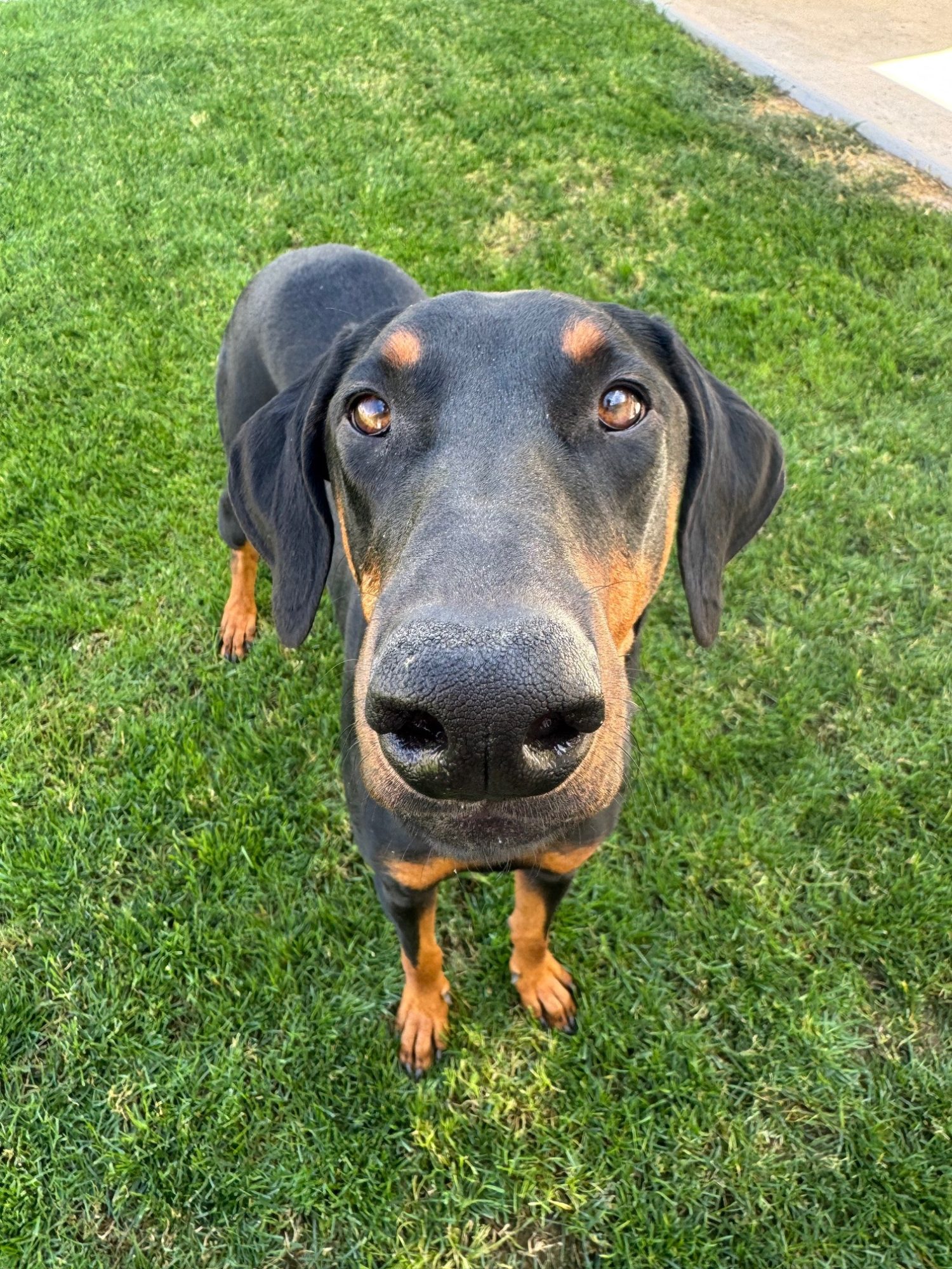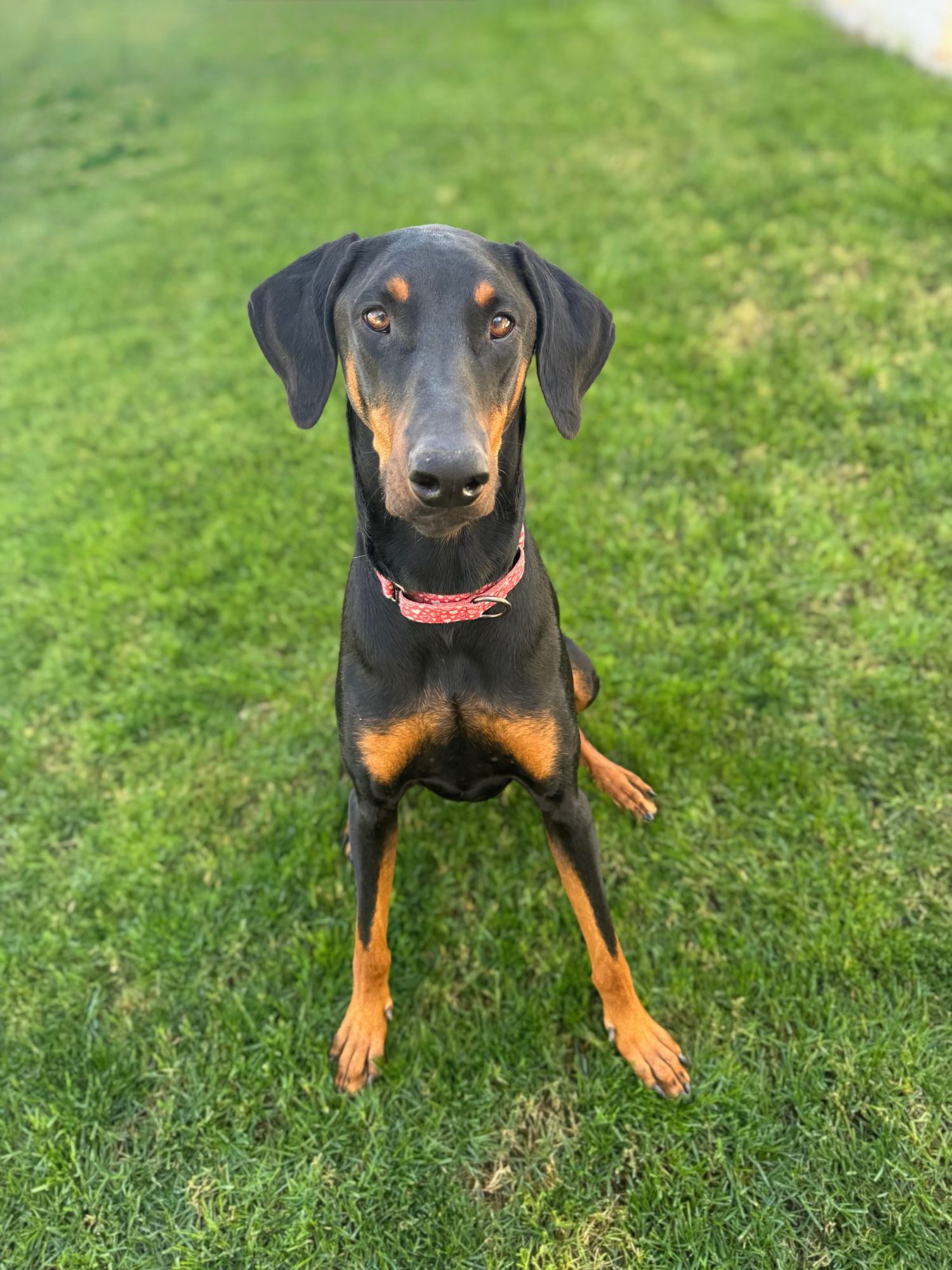 Luna is a 1.5 year old female Doberman. This darling girl is bouncy, energetic, and all puppy. She loves affection, and other dogs. In fact, we believe she will need to live with another dog for her well-being and confidence. Luna is playful, and does well on a leash. While she is a social butterfly at home, Luna can be shy for a minute or two in meeting new people, so her family should advocate for her preferred style of greeting.