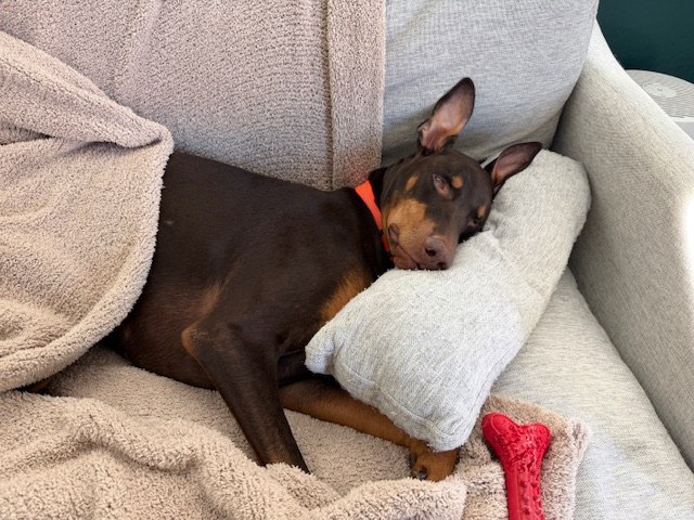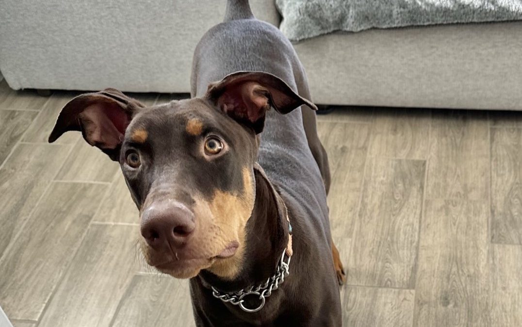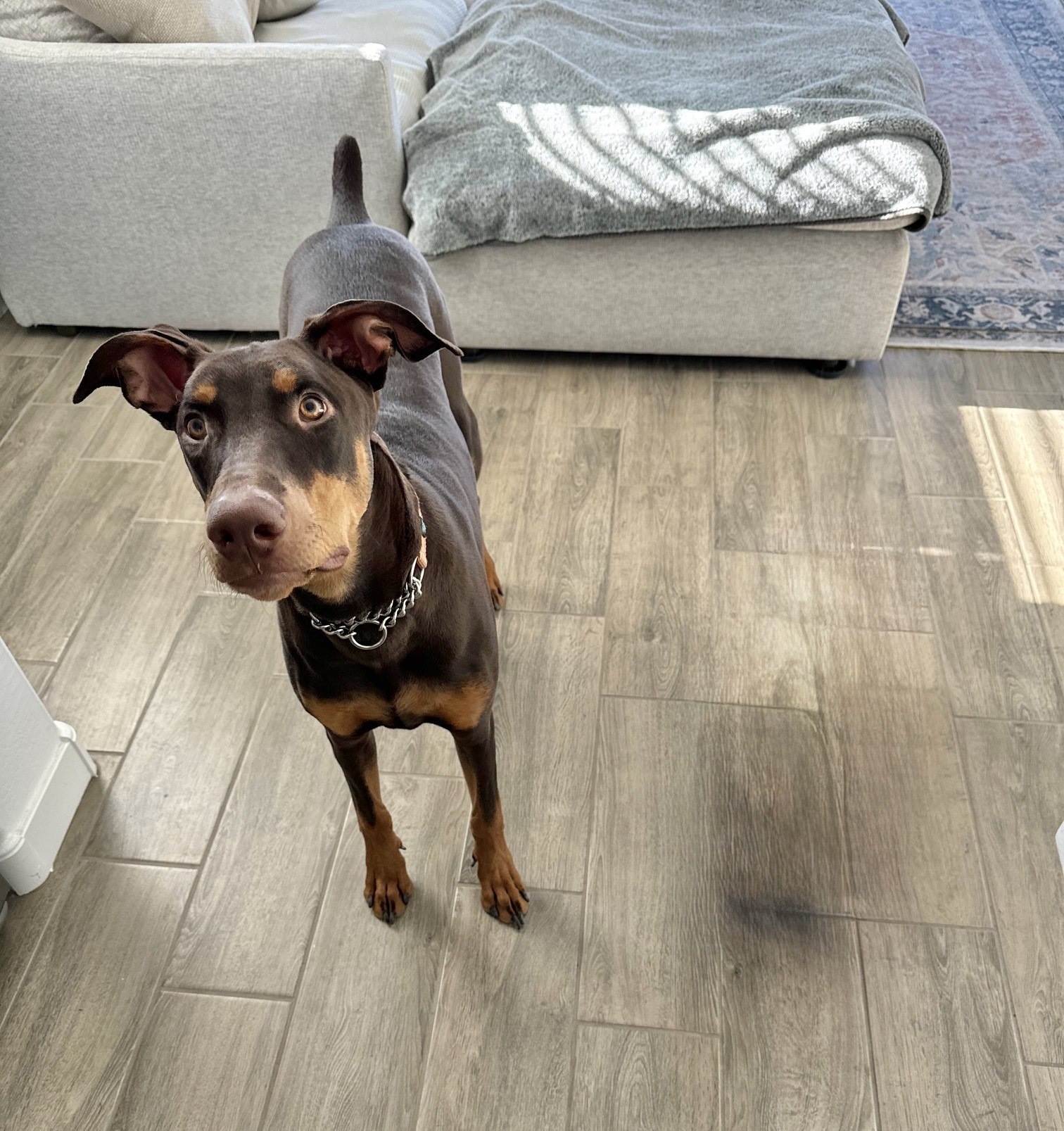 DD is an almost three year old male Doberman with a goofy personality. Full of energy, he may need a tolerant Dobie sibling. We are still getting to know him and he’ll be available for adoption soon.