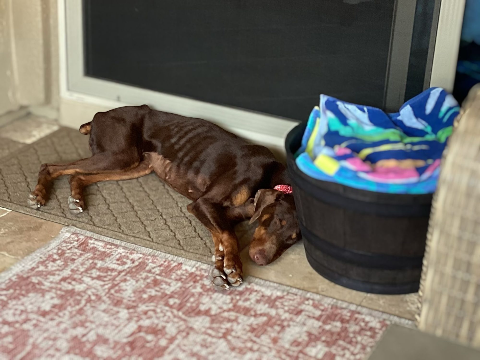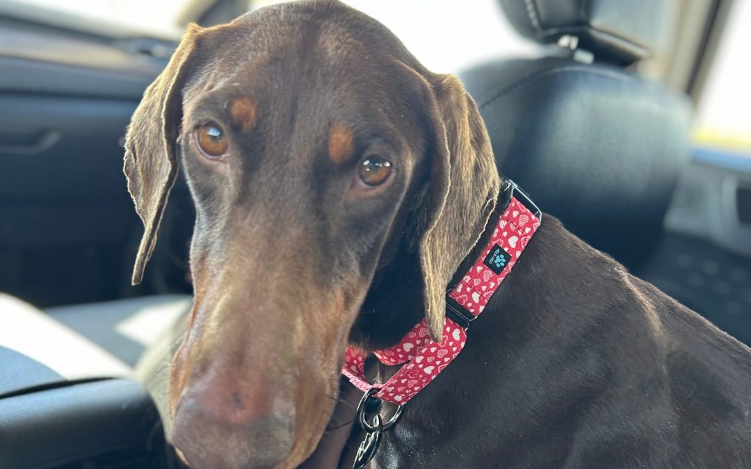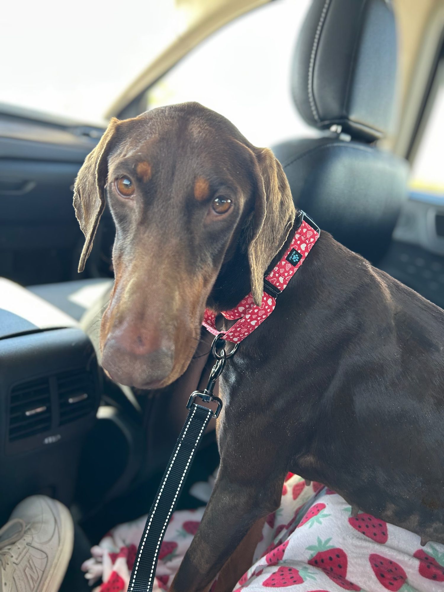 Rilee is a 2 year old female Doberman. She will instantly meet you with a wiggling nub. We know that in her life, she was picked up multiple times as a stray before finally being adopted. There, she lived with another dog and pre-teens. Her adopters realized that they weren’t up for the energy of a teen Doberman, and surrendered her to DHDR. The first thing she did upon arriving at her foster home was dive nose-first into a basket of toys. Rilee is crate trained, and rides well in the car. Riley came to us quite underweight, so we are working on getting her healthy; which is easy since she is very food motivated.